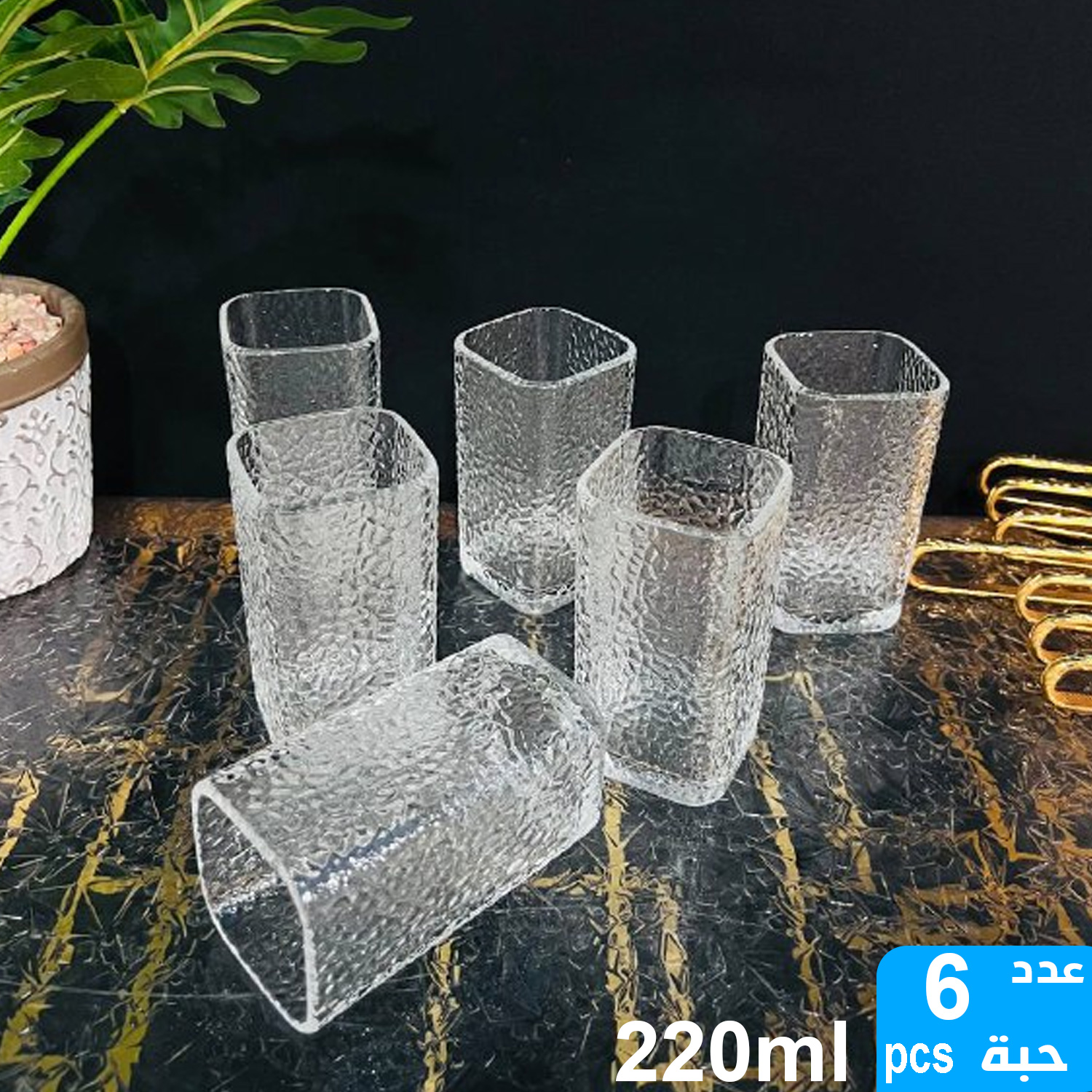 الكاسات مصنوعة من الزجاج الشفاف عالي الجودة، مما يجعلها متينة وعملية. التصميم يضيف لمسة جمالية للكاسات، ويجعلها قطعة مميزة يمكن استخدامها في المناسبات المختلفة.