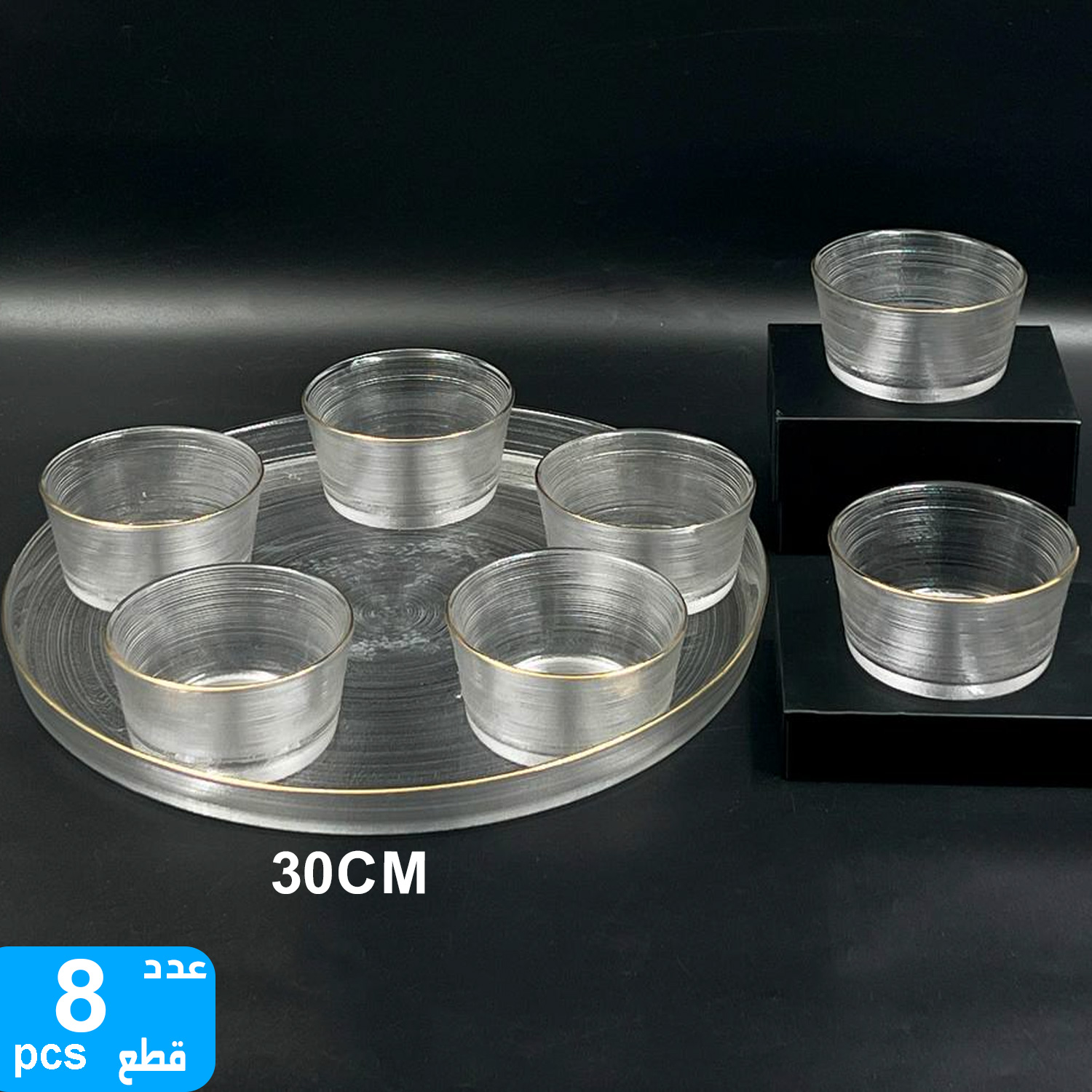 يتكون الطقم من 7 بوادي زجاج . صينية تقديم زجاج