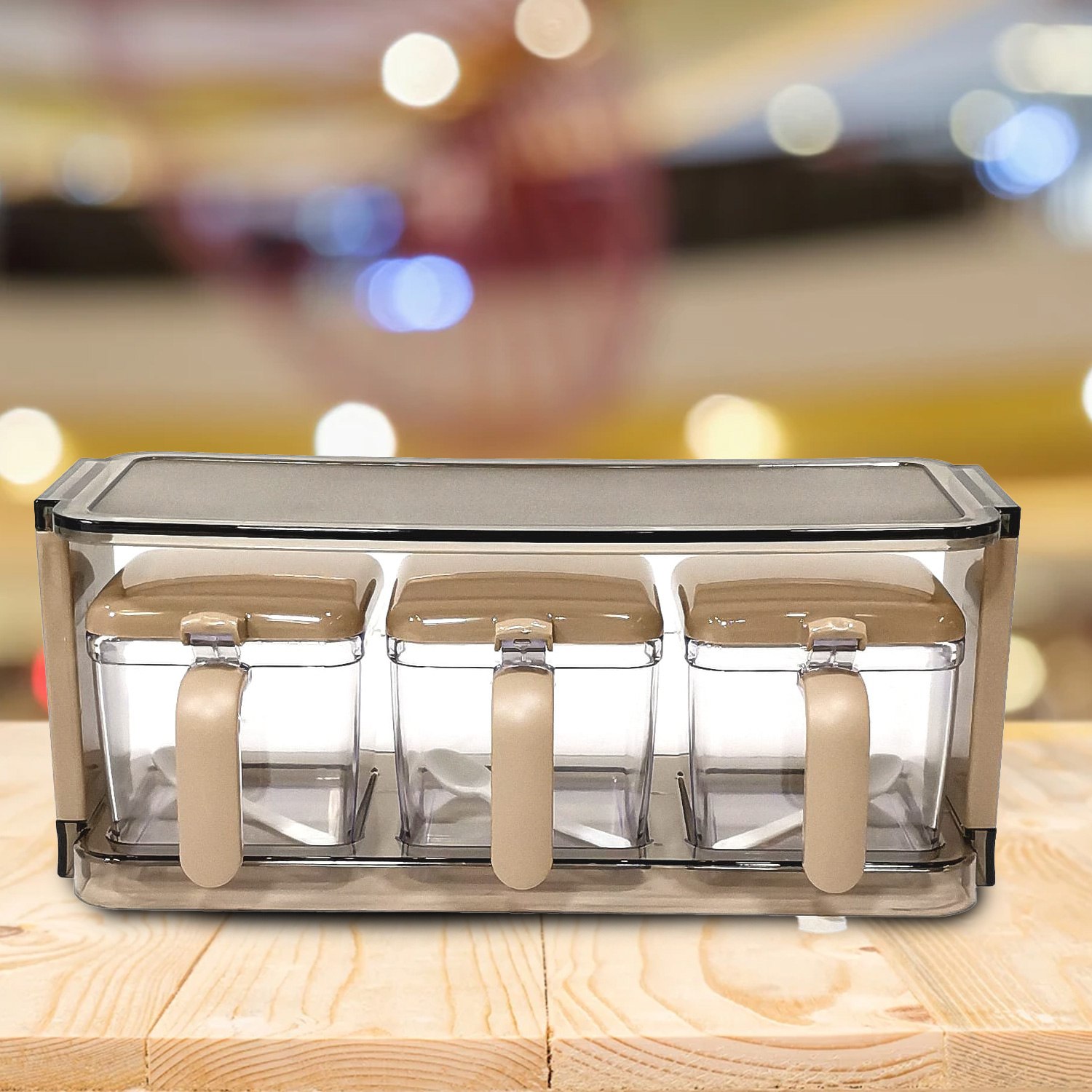 Design: Transparent containers with easy-grip handles, each featuring a dedicated spoon, organized neatly in a compact stand