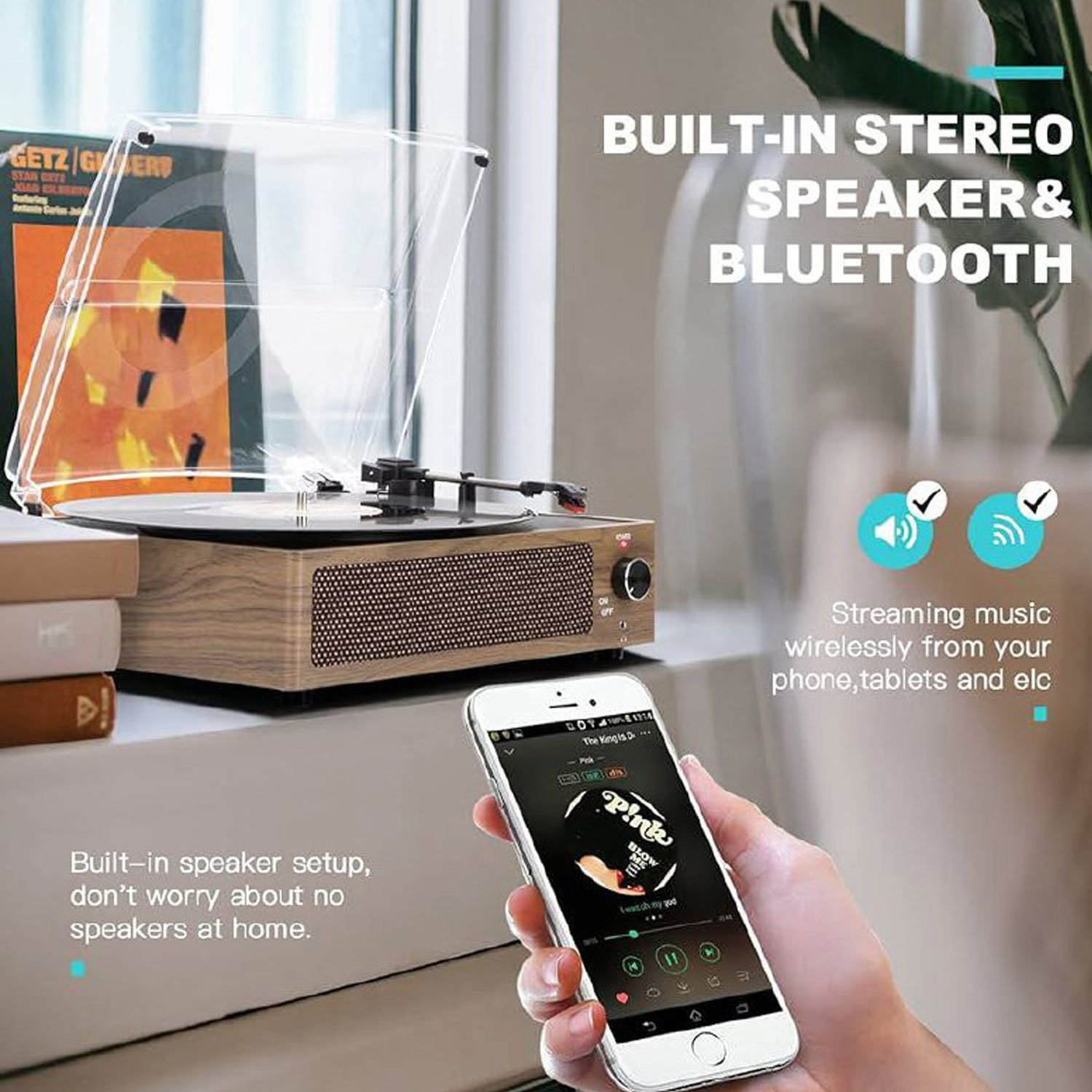 Design: Vintage-style record player with old-radio inspired details, combining nostalgia with modern technology