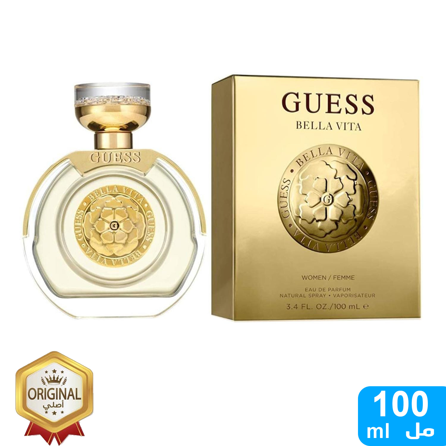 Guess Bella Vita for women is the embodiment of luxury and royal elegance. This fragrance comes in a transparent bottle with a luxurious circular design with a golden cap, which adds a touch of sophistication and charm. The bottle is decorated with the prominent Guess logo, which enhances its royal appearance.